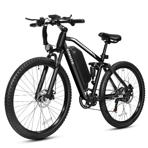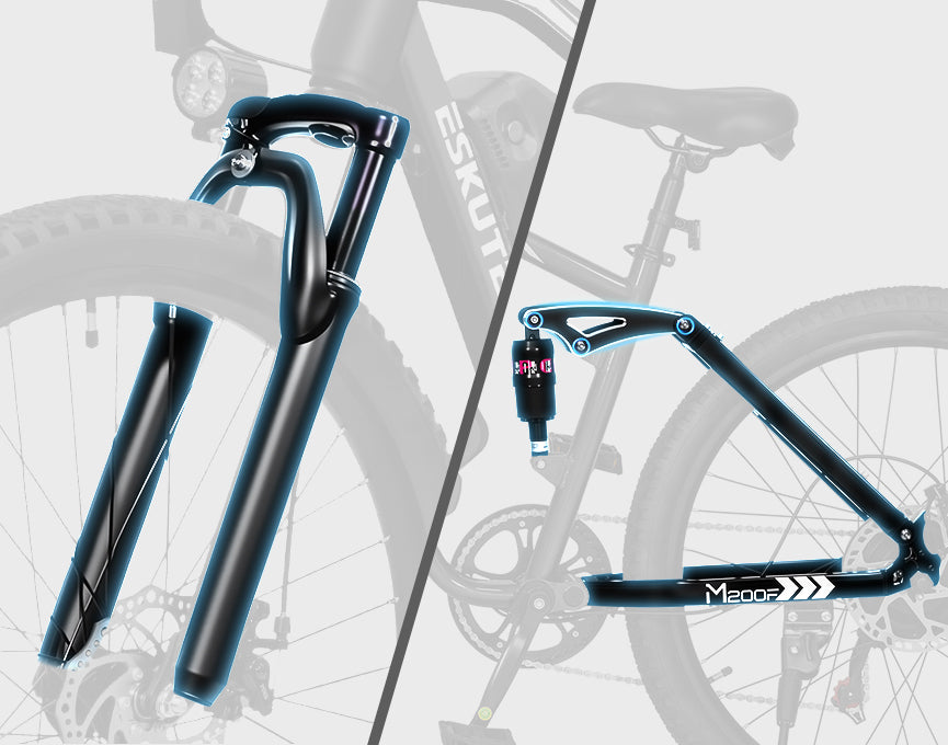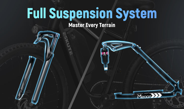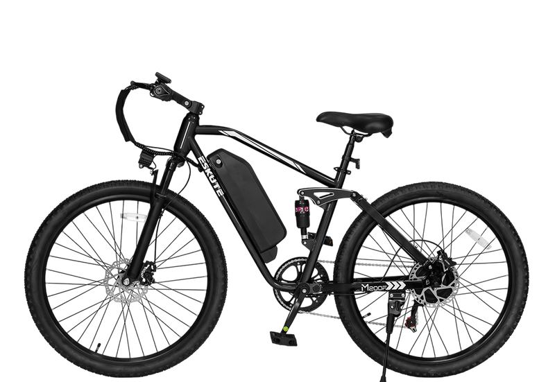 The Eskute M200f 27.5 eBike delivers unstoppable comfort and uncompromising control. Itsfull suspension systemabsorbs bumps for a smooth ride, while thehybrid braking— responsivefront discand powerfulrear hydraulic— ensures precise, fade-free stopping power on any surface. Go further in confidence.
