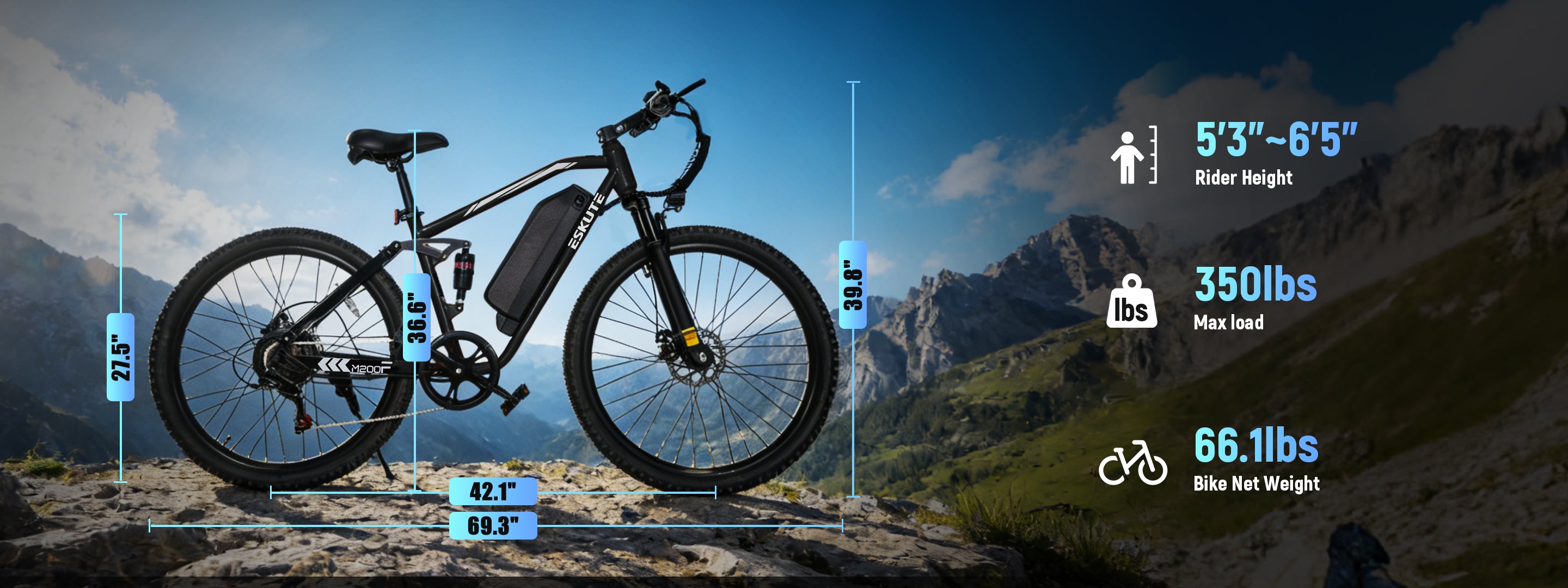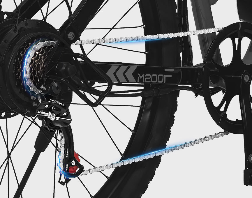 The M200F mountain e-bike supports up to 350 lbs, making it suitable for most riders and extra gear.